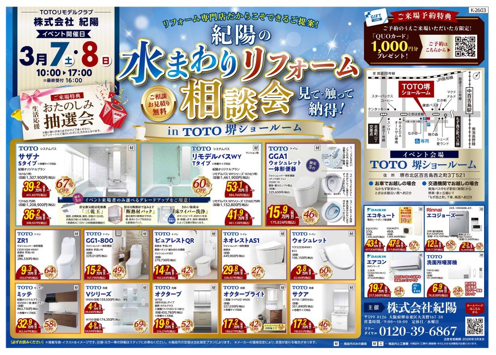 『紀陽の水まわりリフォーム相談会』in TOTOショールーム堺を開催します!NEW